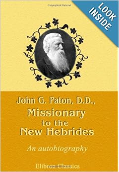 John G. Paton, D.D., Missionary to the New Hebrides. An ... John G. Paton, D.D., Missionary to the New Hebrides. An Autobiography [John Gibson Paton] on Amazon.com. *FREE* shipping on qualifying offers. This Elibron Classics book is a facsimile reprint of a 1891 edition by Hodder and Stoughton, London. John Gibson Paton - Wikipedia John Gibson Paton (24 May 1824 28 January 1907), born in Scotland, was a Protestant missionary to the New Hebrides Islands of the South Pacific. He brought to the natives of the New Hebrides education and Christianity. He developed small industries for them, such as hat making. John G. Paton - The Autobiography of the Pioneer ... John G. Paton - The Autobiography of the Pioneer Missionary to the New Hebrides (Vanuatu) [John G. Paton] on Amazon.com. *FREE* shipping on qualifying offers. The autobiography of John G. Paton contains everything necessary to make it a missionary classic. Born into a Christian family near Dumfries in 1824